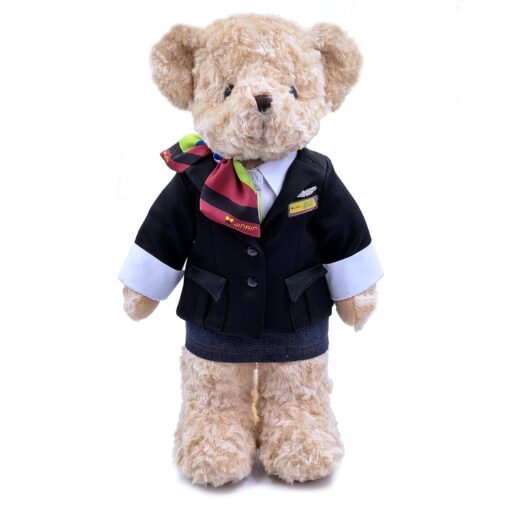 Meet your new travel companion — a 15-inch light brown teddy bear, dressed in the charming Jin Air female cabin crew uniform.